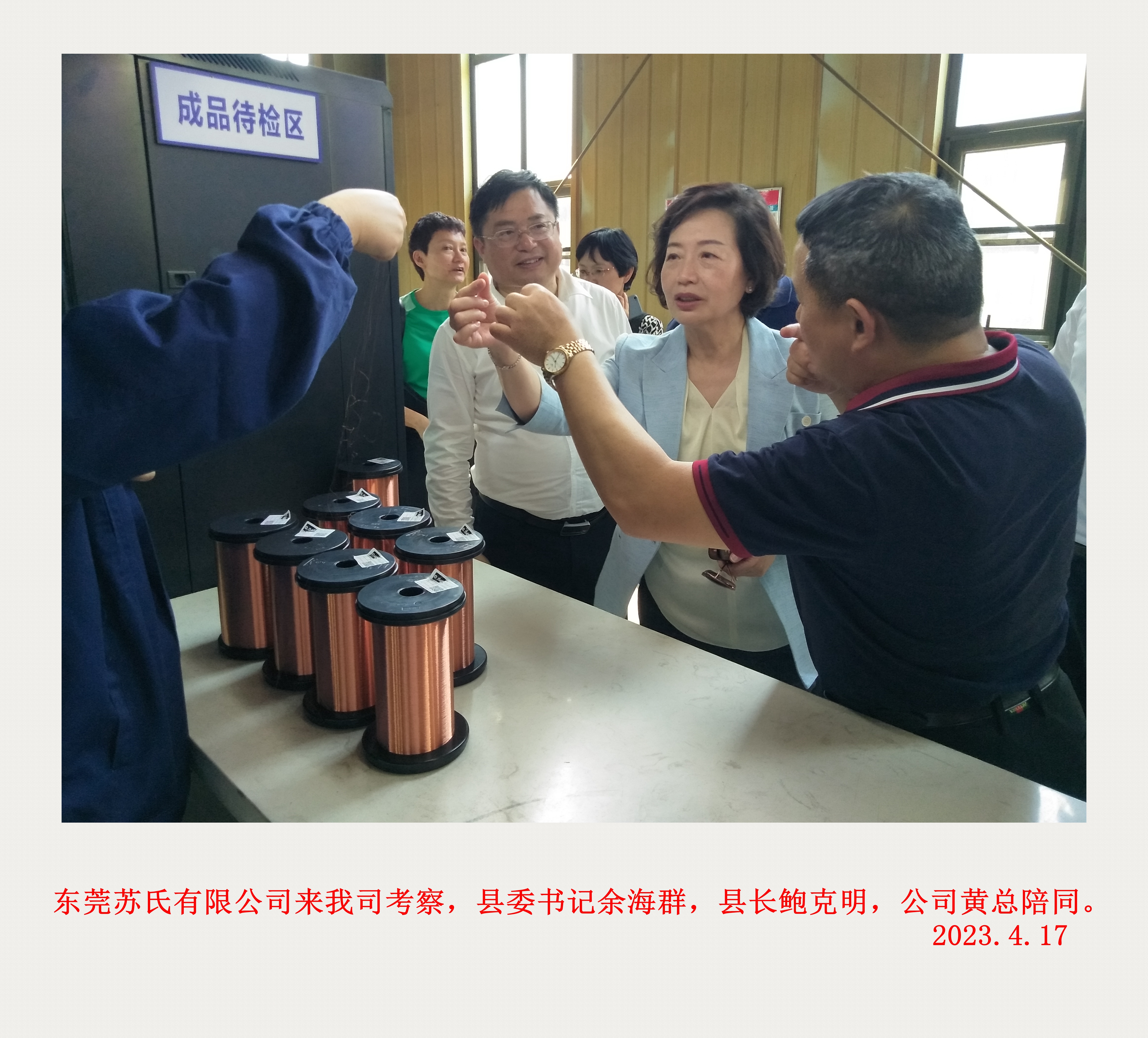 2023年4月17日 東莞蘇氏衛(wèi)生日用品有限公司考察團來我司考察,孝感市委常委、組織部長杭鶯,縣委書記余海群,縣委副書記、縣長鮑克明,公司黃總陪同。